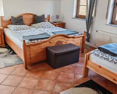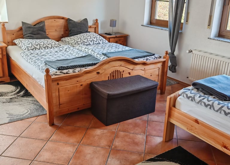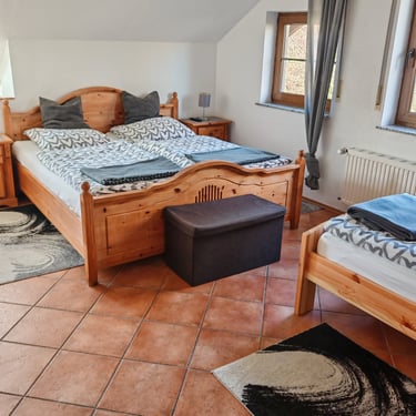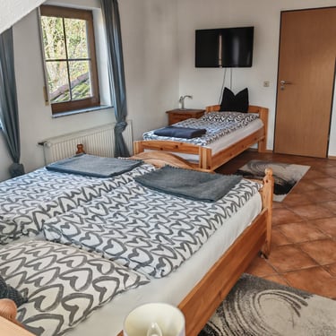Unser helles Dreibettzimmer bietet Komfort und Funktionalität für kleine Familien, Freundesgruppen oder Kolleg:innen.